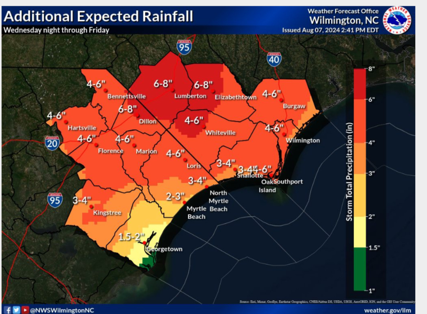 •Fertilizer Rd x Neils Eddy Rd, Riegelwood (high water, black Kia Optima stuck in high water; vehicle remains)