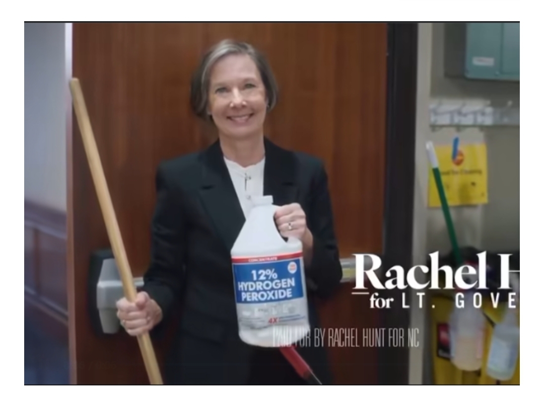 Lt. Governor and gubernatorial hopeful Mark Robinson lambasted Democrat Rachel Hunt yesterday for a TV ad some have considered racist. Hunt, who hopes to replace Robinson in the state’s second chair, is shown on a TV commercial holding a mop and bottle of hydrogen peroxide, which she says is what she’ll use to clean Robinson’s current office.
