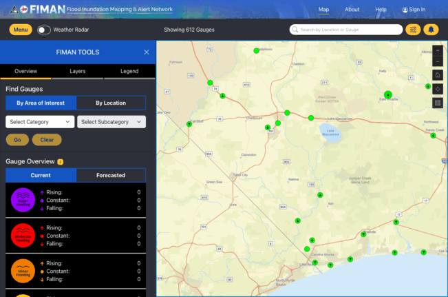 FIMAN gauges are placed in strategic spots throughout the state to provide live updates on water levels. Similar gauges are at Soles Swamp in downtown Whiteville and elsewhere in the county. Anyone with a computer or smartphone can check the level at any gauge at any time, as FIMAN systems upload new data to a searchable website. The website also allows users to set up scenarios based on rainfall and flooding to get a satellite view of flood impacts.