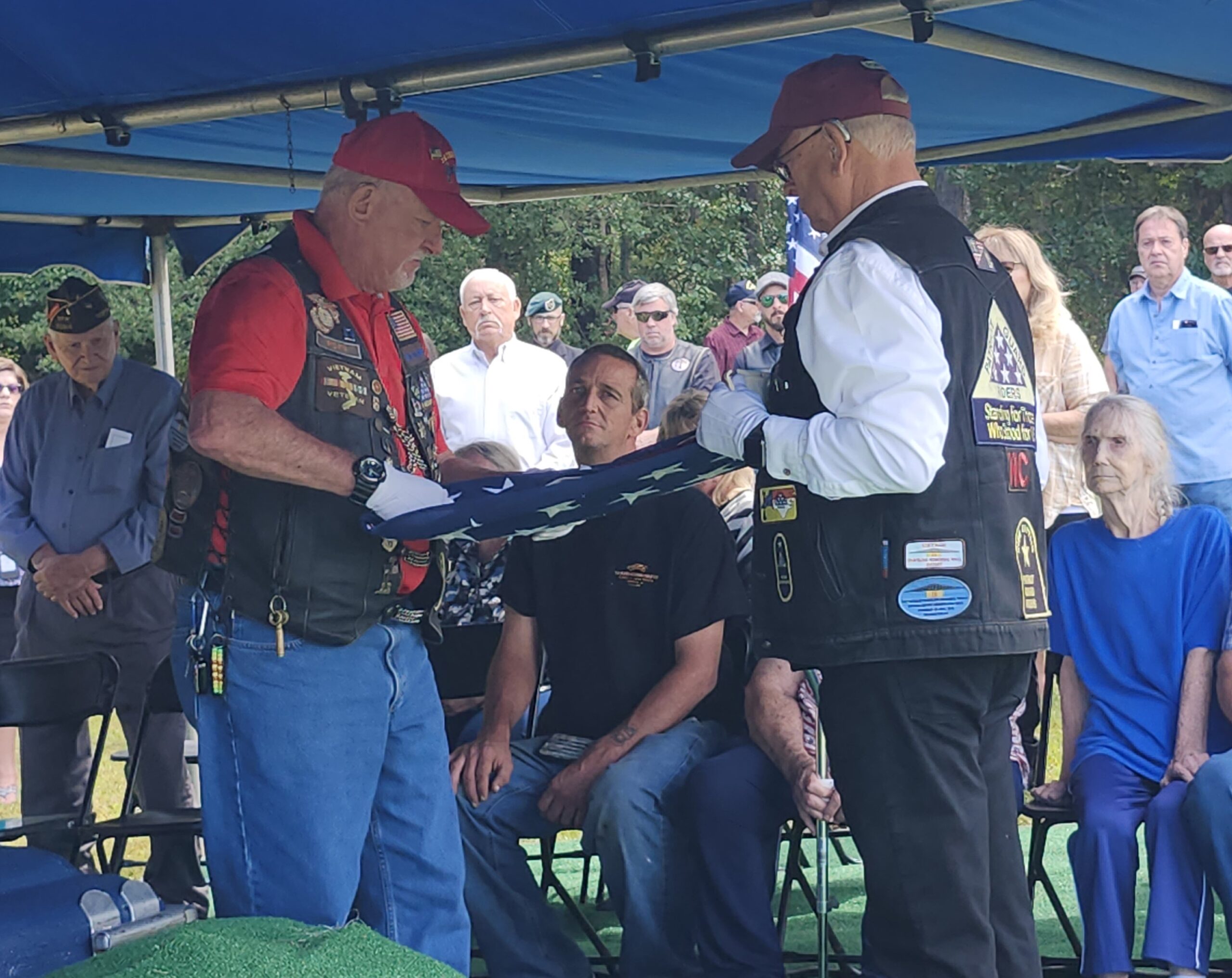 Jefferson Weaver led the audience in singing Amazing Grace. All the veterans in attendance filed past the casket and saluted Ward a final time as the honor guard folded the flag and presented it to Mrs. Cribb. After Taps and a 21-gun salute, a closing prayer was given by Marcia-McMullen House for Heroes.