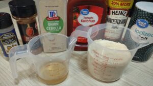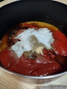 For this recipe you’re going to need one and half cups of ketchup, one and half cups of brown sugar, one fourth of a cup of apple cider vinegar, two tablespoons of Worchester sauce, two teaspoons of paprika, two teaspoons of onion powder, one teaspoon of black pepper, and two teaspoons of salt.