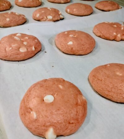 Since I did the red velvet cookies the last time I made these, this time I opted for strawberry cake mix and creme chips.