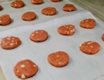 As you take the cookies out of the oven, grab the corner of the parchment paper and slide them out onto your countertop to cool. Slightly angle your pan almost level with the uncooked dough filled sheets and pull the corner of the paper onto your baking pan to refill it.