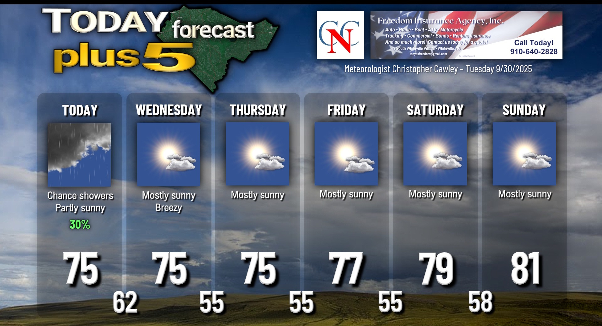 This weather update is sponsored by Freedom Insurance of Whiteville. No weather worries with Freedom Insurance. For home, car, boat, or whatever you need, Freedom can provide customized coverage to keep you and your family safe. Contact Freedom today at 910-640-2828!