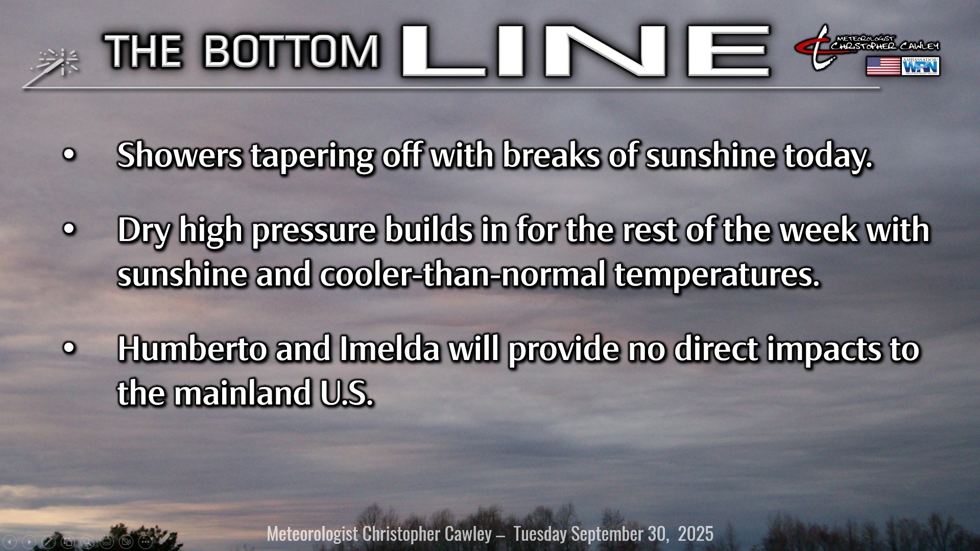 The frontal boundary along the coast helping bring in rain from Imelda yesterday and last night will be “pulled away” from the area with the departing storm system.