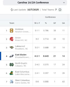East Bladen falls to 4-2-1 in the conference and 7-5-3 overall. They will host North Duplin (2-4-2, 2-5-2) on Oct. 18. Hobbton’s next match will be at North Duplin on Oct. 13.