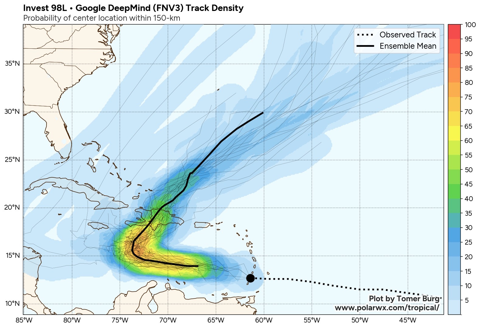 Modeling suggests that this will take a very hard right-hand turn and move north/east, bringing significant impacts to Haiti and the Dominican Republic, before lifting away from land masses. This is shown here with the Google DeepMind model, which so far this season has outperformed the “legacy” modeling (GFS, Euro, etc.).