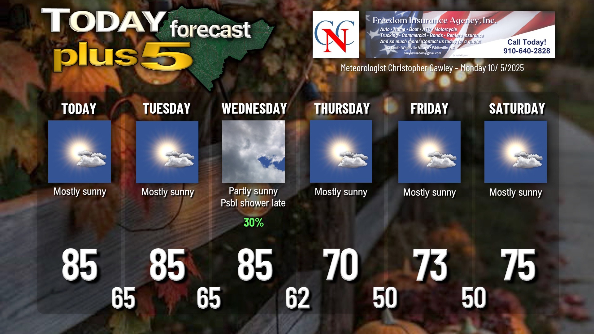 This weather update is sponsored by Freedom Insurance of Whiteville. No weather worries with Freedom Insurance. For home, car, boat, or whatever you need, Freedom can provide customized coverage to keep you and your family safe. Contact Freedom today at 910-640-2828!