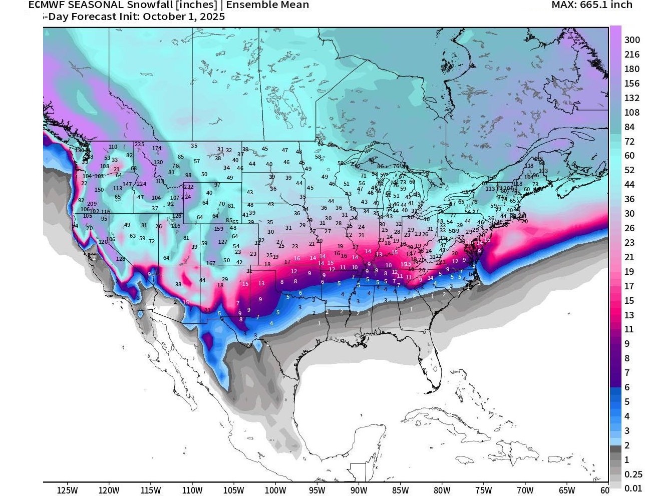 Just for fun before we cover the tropics, the latest seasonal European model snowfall chart has just been released, showing what the Euro deterministic says the snowfall will be for the entire season. Now, I put as much faith in this as I do winning the lottery… but it’s fun to look at. It shows roughly 2 inches of snow for the area … which is actually close to the “seasonal normal value.”