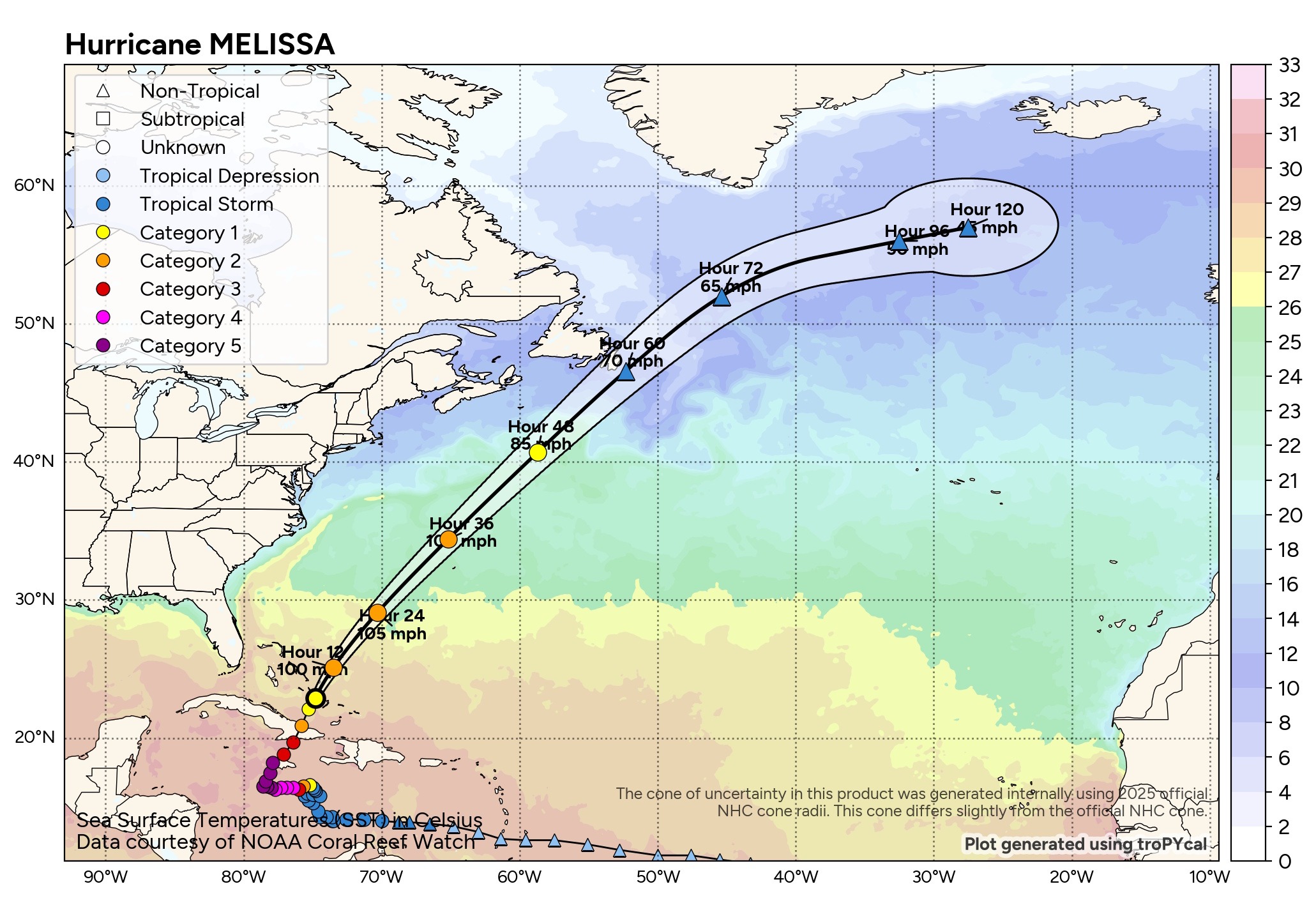 TROPICS: Melissa has her pedal to the floorboards as she pushes north/east over the Atlantic. She’ll brush Bermuda with a very quick, glancing blow before cruising onto the upper latitudes.