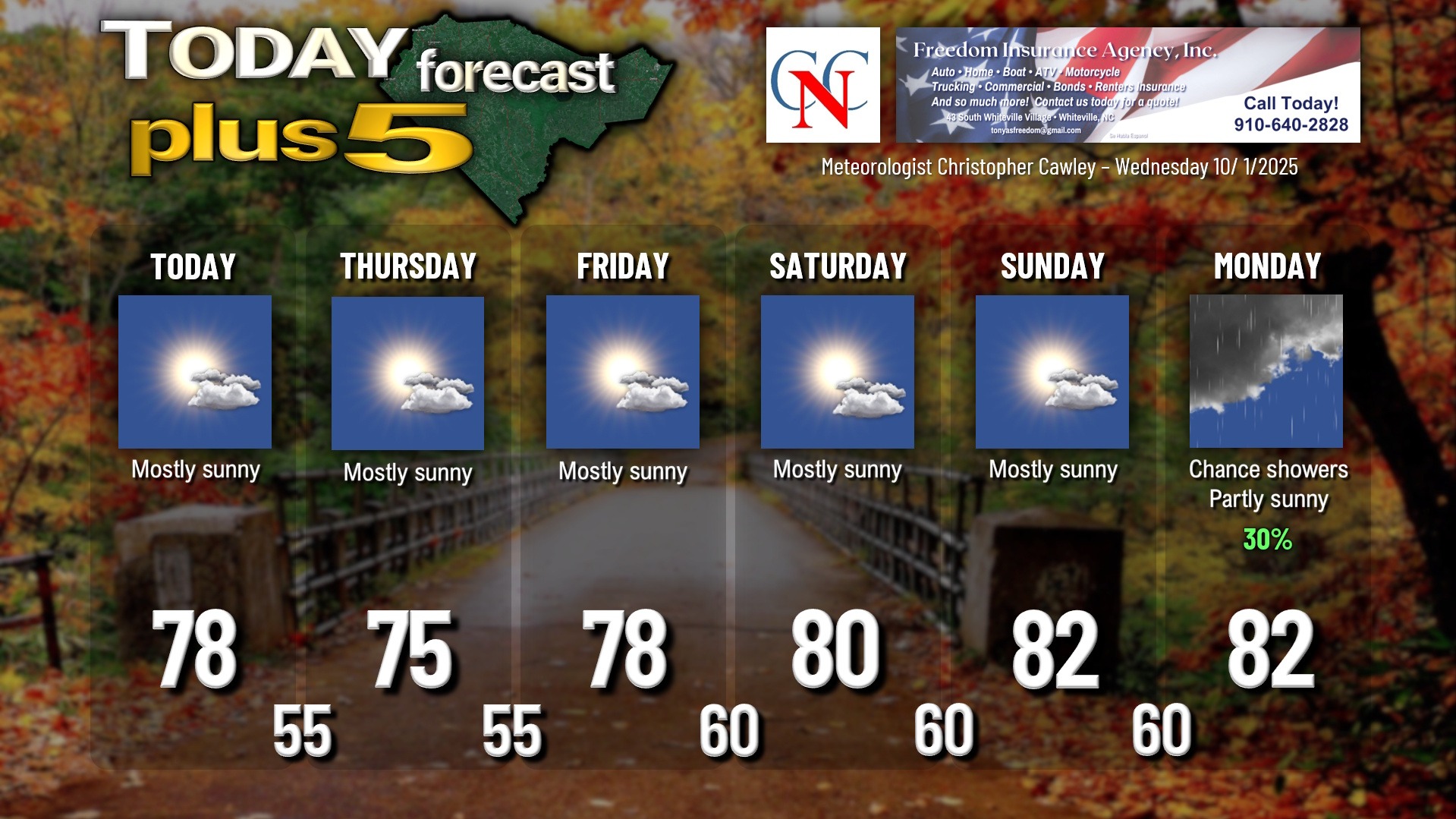 This weather update is sponsored by Freedom Insurance of Whiteville. No weather worries with Freedom Insurance. For home, car, boat, or whatever you need, Freedom can provide customized coverage to keep you and your family safe. Contact Freedom today at 910-640-2828!