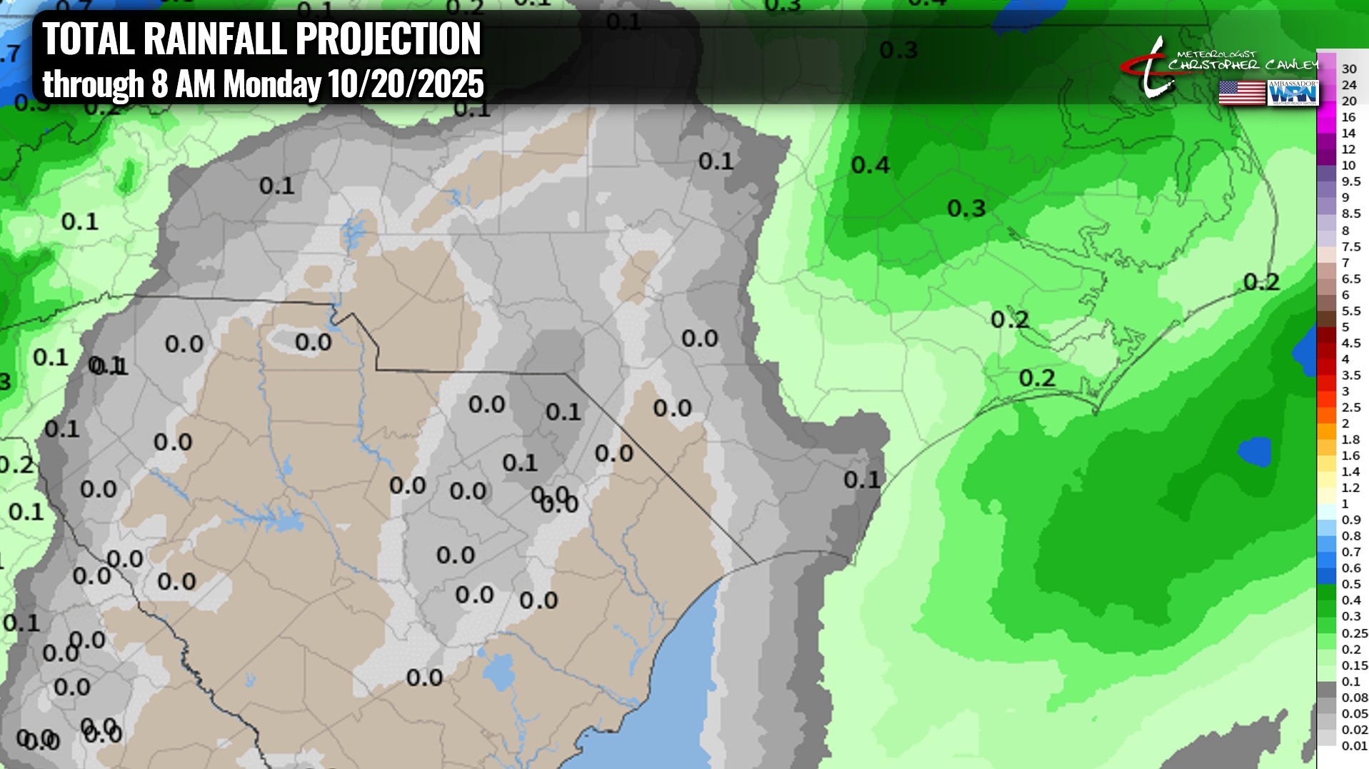 Dry weather will prevail through the next 5-7 days. Here’s the model blend rain forecast through early next Monday.