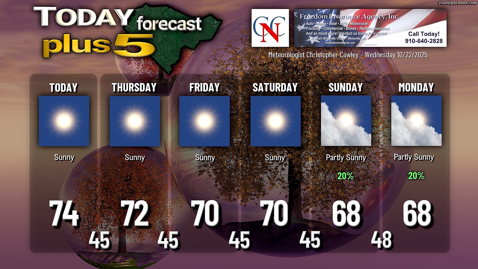 This weather update is sponsored by Freedom Insurance of Whiteville. No weather worries with Freedom Insurance. For home, car, boat, or whatever you need, Freedom can provide customized coverage to keep you and your family safe. Contact Freedom today at 910-640-2828!