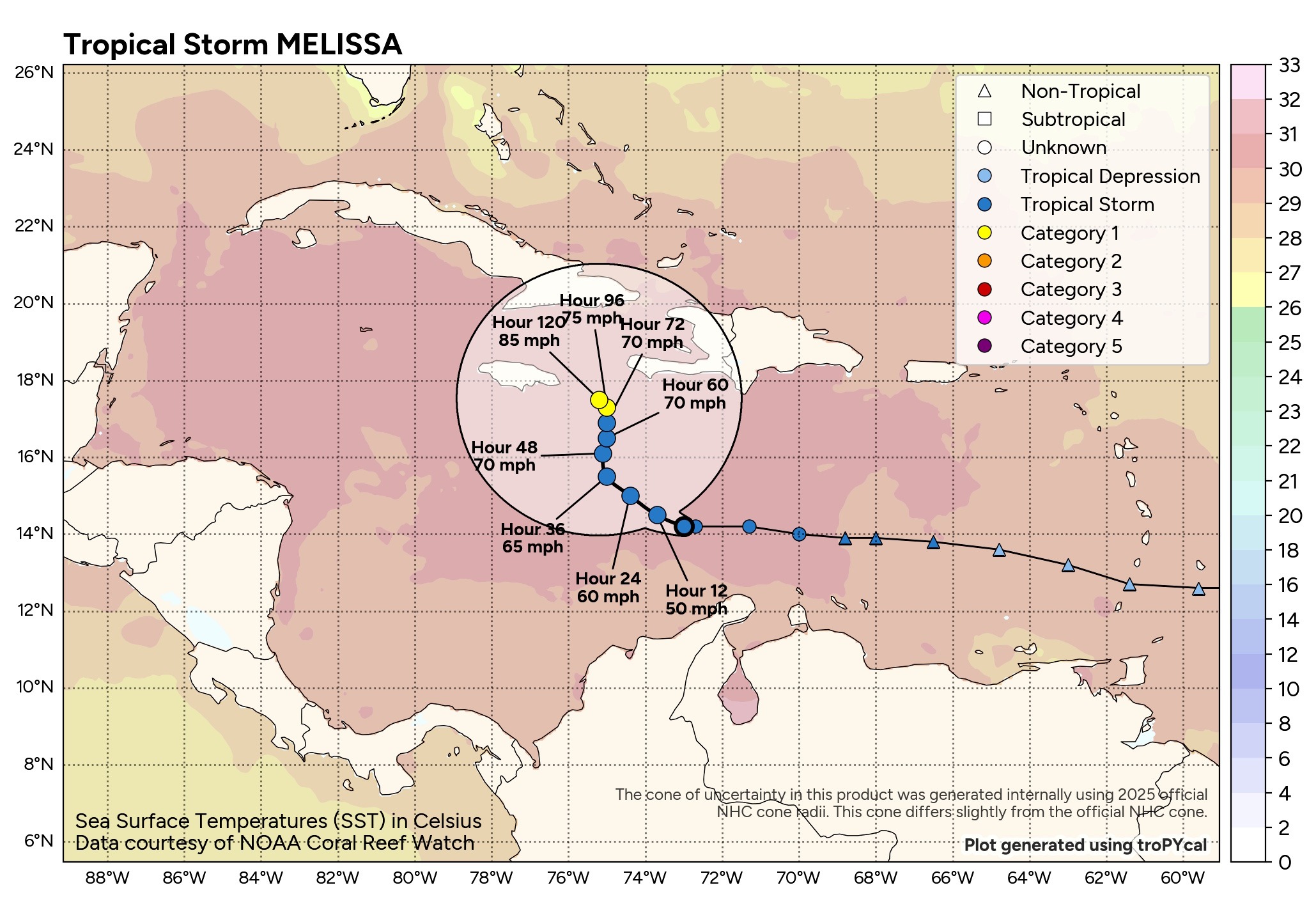 Where she goes will greatly depend on how strong she gets. The models really diverge on the solutions. If Melissa organizes like the GFS predicts, it could turn northeastward over Hispaniola. If Melissa remains rather lopsided (as she is now), it will likely stall and drift westward as a high pressure ridge builds to the north. The official Hurricane Center track very closely resembles the short-term of the Google DeepMind.