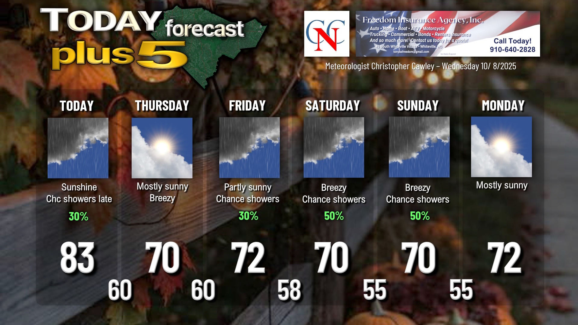 This weather update is sponsored by Freedom Insurance of Whiteville. No weather worries with Freedom Insurance. For home, car, boat, or whatever you need, Freedom can provide customized coverage to keep you and your family safe. Contact Freedom today at 910-640-2828!