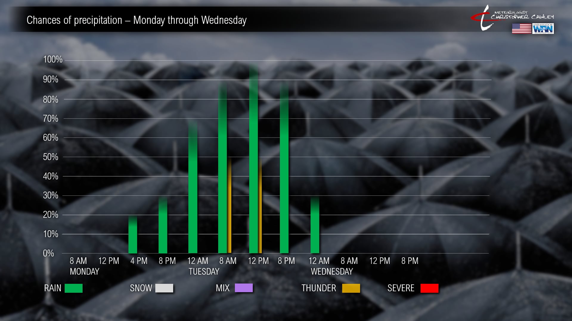 December will get off to a very rainy start as a strong storm system impacts our area with widespread rainfall and the potential for thunderstorms late Monday night through Tuesday.