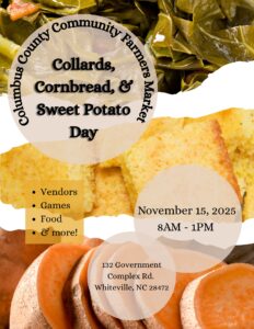 It’s Collards, Cornbread, and Sweet Potato Day this Saturday, Nov. 15, at the Columbus County Farmers Market. From 8 a.m.-1 p.m., you can come out and enjoy Southern foods, vendors, games, and lots of fun. It’s a great opportunity to get some early Christmas shopping done.