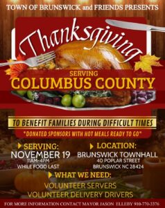The Town of Brunswick and Friends will be serving Thanksgiving dinner to families in need on Nov. 19 from 11 a.m. -4 p.m. at Town Hall. Volunteer servers and delivery drivers are still needed for the event, and if you would like to help out, you can contact Mayor Jason Ellerby at 910.770.3376. Brunswick Town Hall’s address is 40 Popular Street.