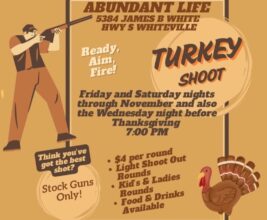 There will be light shoot out rounds, kid’s and ladies’ rounds, and food, drink, and concessions will be available. Abundant Life is located at 5384 James B. White Highway South in Whiteville.