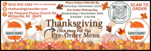 Orders must be placed by Nov. 22 online, and pickup will be on Nov. 26 from 9 a.m.-7:30 p.m. You can call or text 910.840.3362 or visit chefsarahgoreorder.com for prices and information. Sarah’s Market is located at 791 Pleasant Plains Church Road in Whiteville.