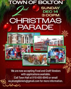 The Town of Bolton is accepting food and vendor applications for their second annual Christmas parade on Dec. 14 at 3 p.m. To find out how to get yours, call Town Hall at 910.655.8945, or shoot an email to aa.youngdaniels@gmail.com.