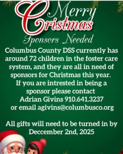 The Columbus County Department of Social Services is looking for Christmas sponsorship to help bring joy to children in foster care this holiday season. Those interested will receive a wish list for a little boy or girl to make this Christmas a very special one.