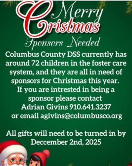 If you, your church, business, or civic group would like to sponsor a child, please contact Adrian Givens at 910.641.3237 or send an email to agivins@columbusco.org. All gifts need to be turned in by Dec. 2.
