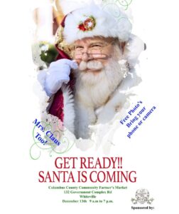 The Columbus County Farmers Market invites you to experience the magic of Christmas on Dec. 13 from 9 a.m.- 7 p.m. Meet Mr. and Mrs. Claus, the Grinch, and Cindy the Who. The Carolina Country Cruisers will be there with cars and razors from 9 a.m.-1 p.m. and the Edgewood Chorus will perform at 10:30 a.m.