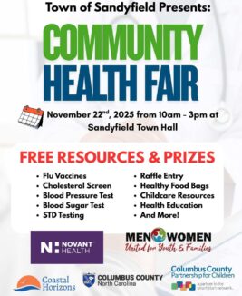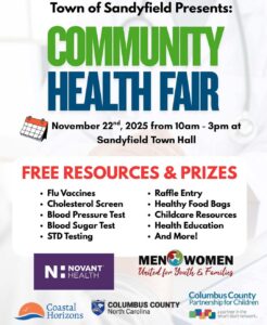 The Town of Sandyfield will be hosting a Community Health Fair on Nov. 22 from 10 a.m.-3 p.m. at Town Hall. There will be free resource information, free health screenings, and prizes. The facility is located at 1795 Woodyard Road in Riegelwood.