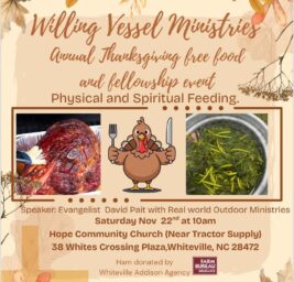 Willing Vessels Ministries will have their Thanksgiving meal giveaway on Nov. 22 beginning at 10 a.m. in the parking lot of Hope Community Church next to Tractor Supply. The speaker this year will be Evangelist David Pait with Real World Outdoor Ministries.