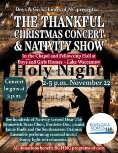 The Boys and Girls Home of North Carolina will have their Thankful Christmas concert and nativity show on Nov. 22 at the BGHNC Chapel and Fellowship Hall. You can come early, enjoy refreshments, and browse through hundreds of nativities for sale.