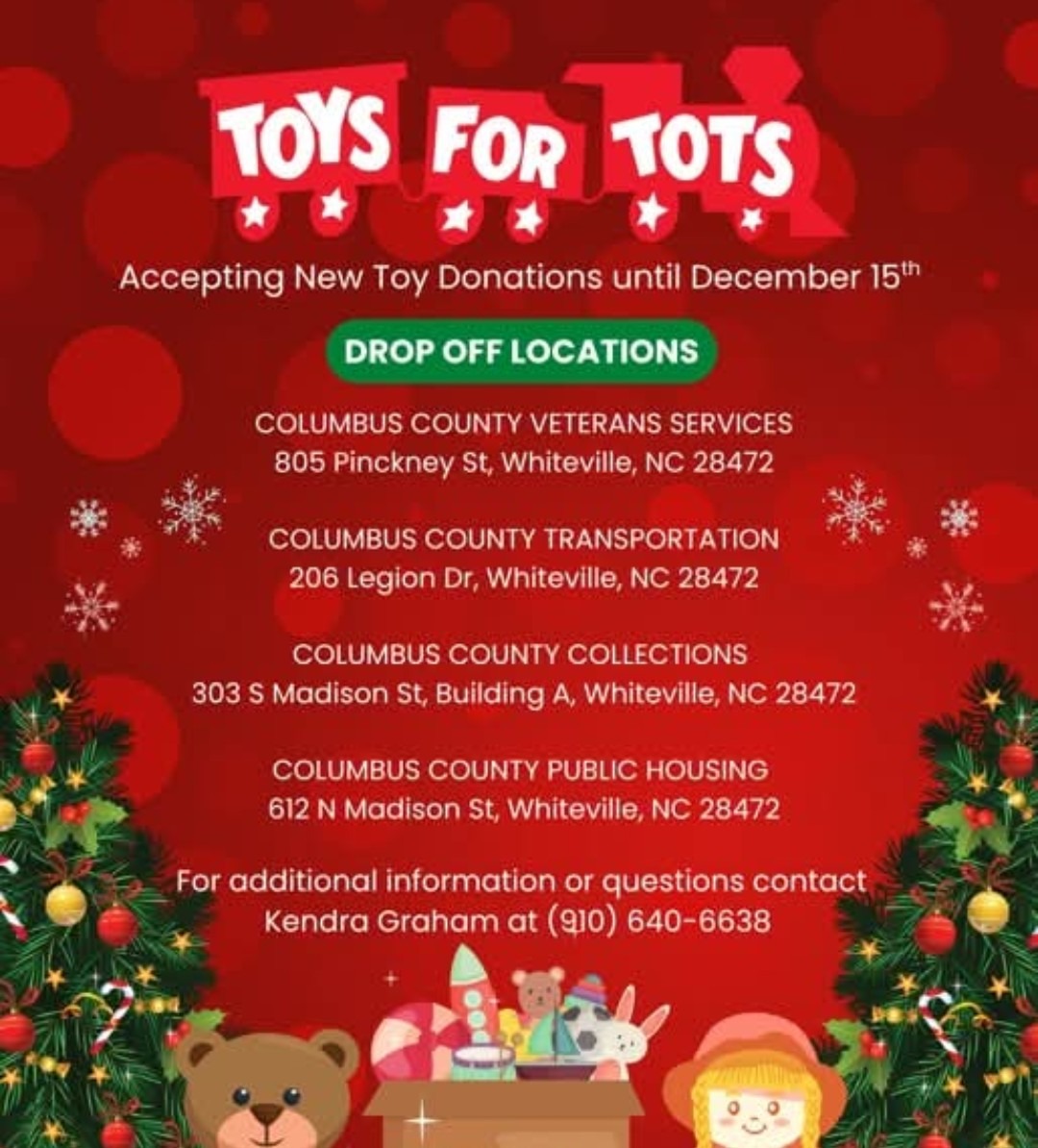 Toys for Tots will be accepting new and unwrapped toys for children ages 0-18 years at various locations in Whiteville until Dec. 15. All donations will be distributed to children right here in Columbus