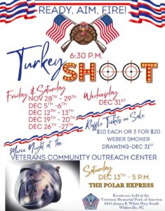 Get ready, aim, and fire every Friday and Saturday night from Nov. 28-Dec. 27 and on Wednesday, Dec. 31 with the Veterans Memorial Park of America Turkey Shoot. The event will begin at 6:30 p.m. each evening. Raffle tickets are also up for grabs for a Weber smoker. Tickets are $10 each or 3 for $20, and the drawing will be held on Dec. 31.