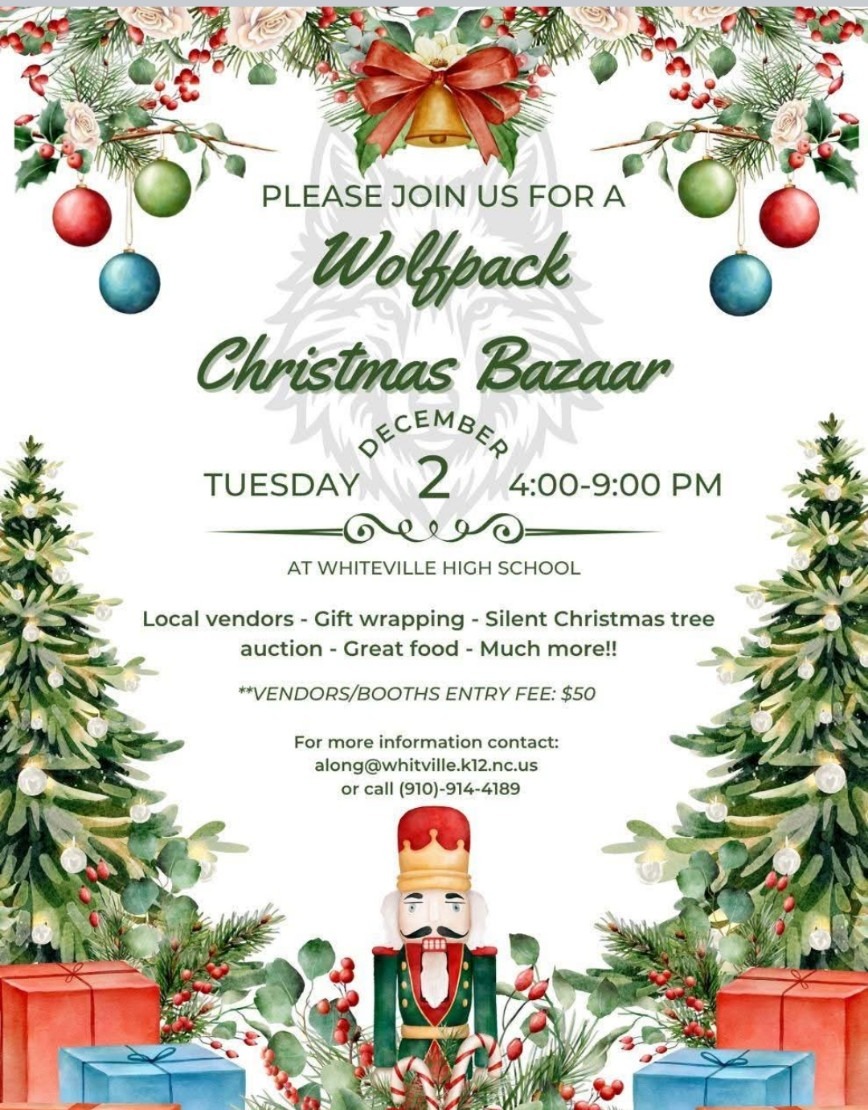 Attention all shoppers, Whiteville High School will be hosting the Wolfpack Christmas Bazaar on Tuesday, Dec. 2, from 4-9 p.m. at the school. There will be local vendors set up, gift wrapping, a silent Christmas tree auction, food trucks, and so much more.