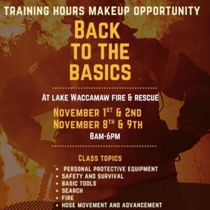 Lake Waccamaw Fire and Rescue is hosting an in-house training series on Nov. 8-9 from 8 a.m.-6 p.m. Anyone from nearby departments are welcomed to join and get in a few extra training hours before the end of the year. If you aren’t on a department and are interested in joining one, feel free to come out and learn some new skills.