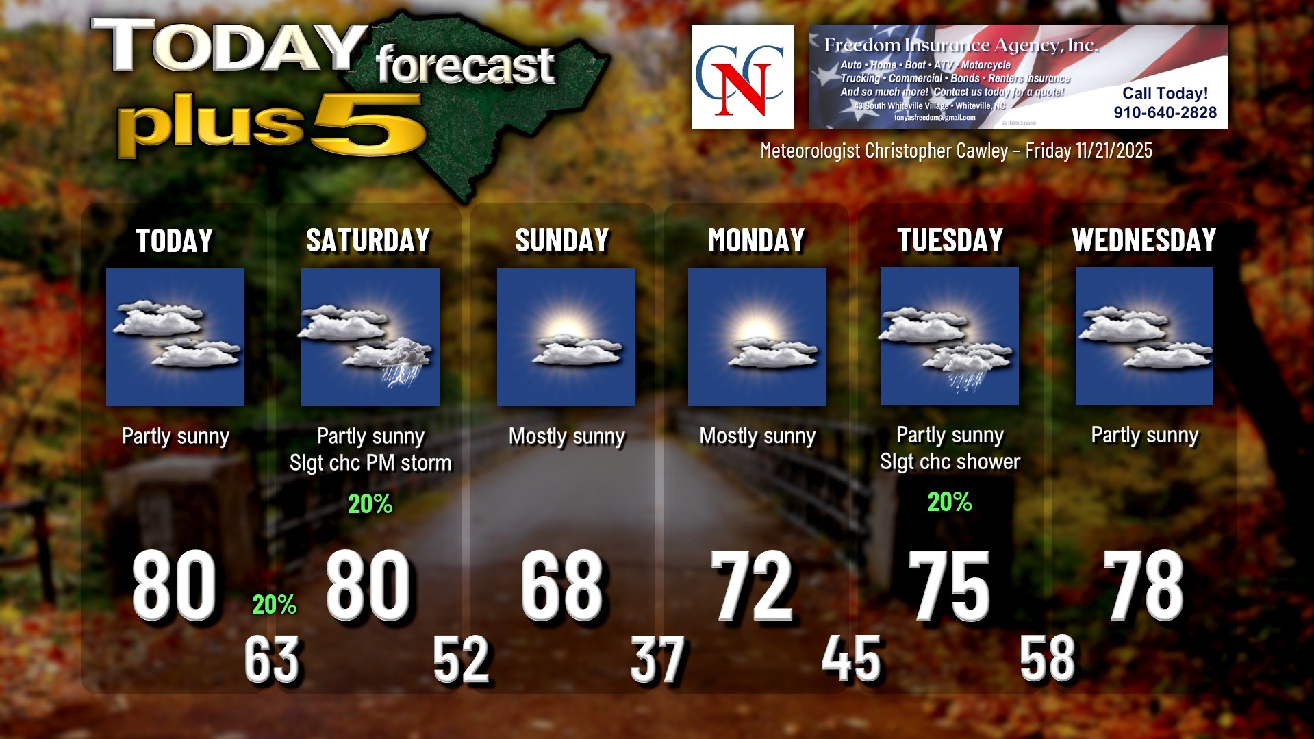 This weather update is sponsored by Freedom Insurance of Whiteville. Trust Freedom Insurance to give you clear blue skies when it comes to home, car, boat, or whatever insurance you need. Let Freedom provide customized coverage to keep you and your family safe. Contact Freedom today at 910-640-2828!