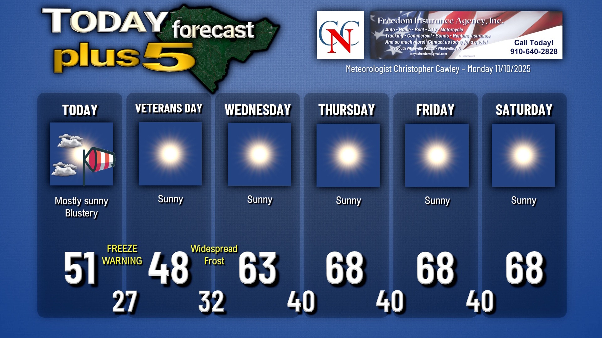 This weather update is sponsored by Freedom Insurance of Whiteville. Trust Freedom Insurance to give you clear blue skies when it comes to home, car, boat, or whatever insurance you need. Let Freedom provide customized coverage to keep you and your family safe. Contact Freedom today at 910-640-2828!