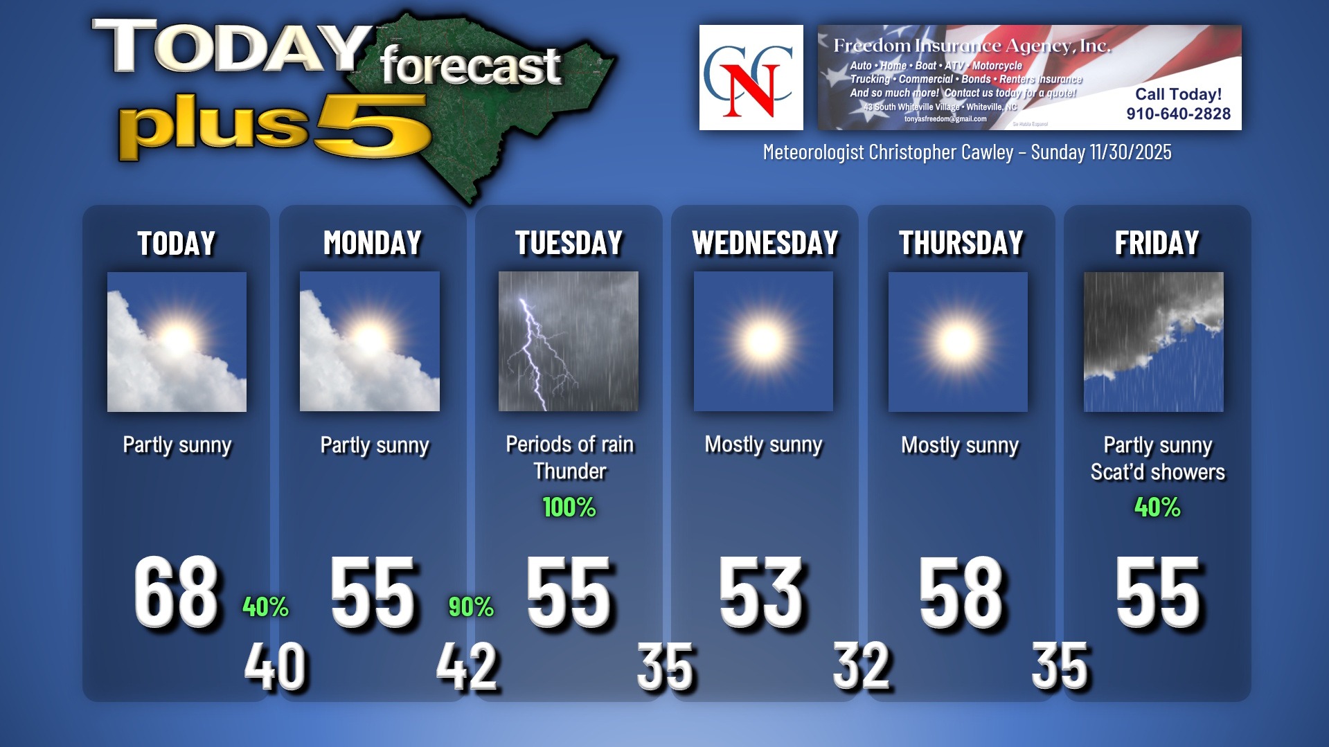 This weather update is sponsored by Freedom Insurance of Whiteville. You can trust Freedom Insurance to give you clear blue skies when it comes to home, car, boat, or whatever insurance you need. Let Freedom provide customized coverage to keep you and your family safe. Contact Freedom today at 910-640-2828!
