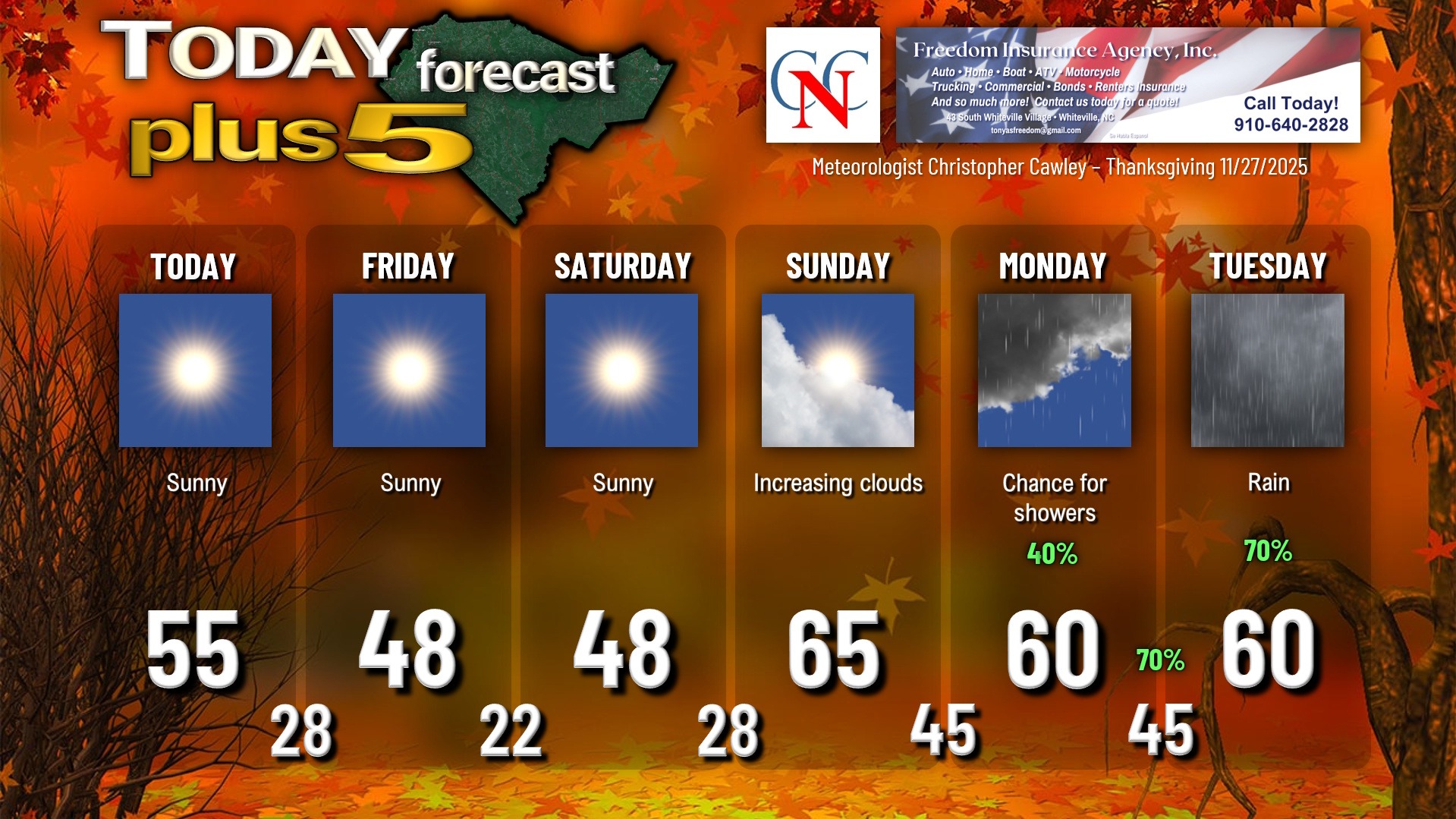 This weather update is sponsored by Freedom Insurance of Whiteville. Trust Freedom Insurance to give you clear blue skies when it comes to home, car, boat, or whatever insurance you need. Let Freedom provide customized coverage to keep you and your family safe. Contact Freedom today at 910-640-2828!
