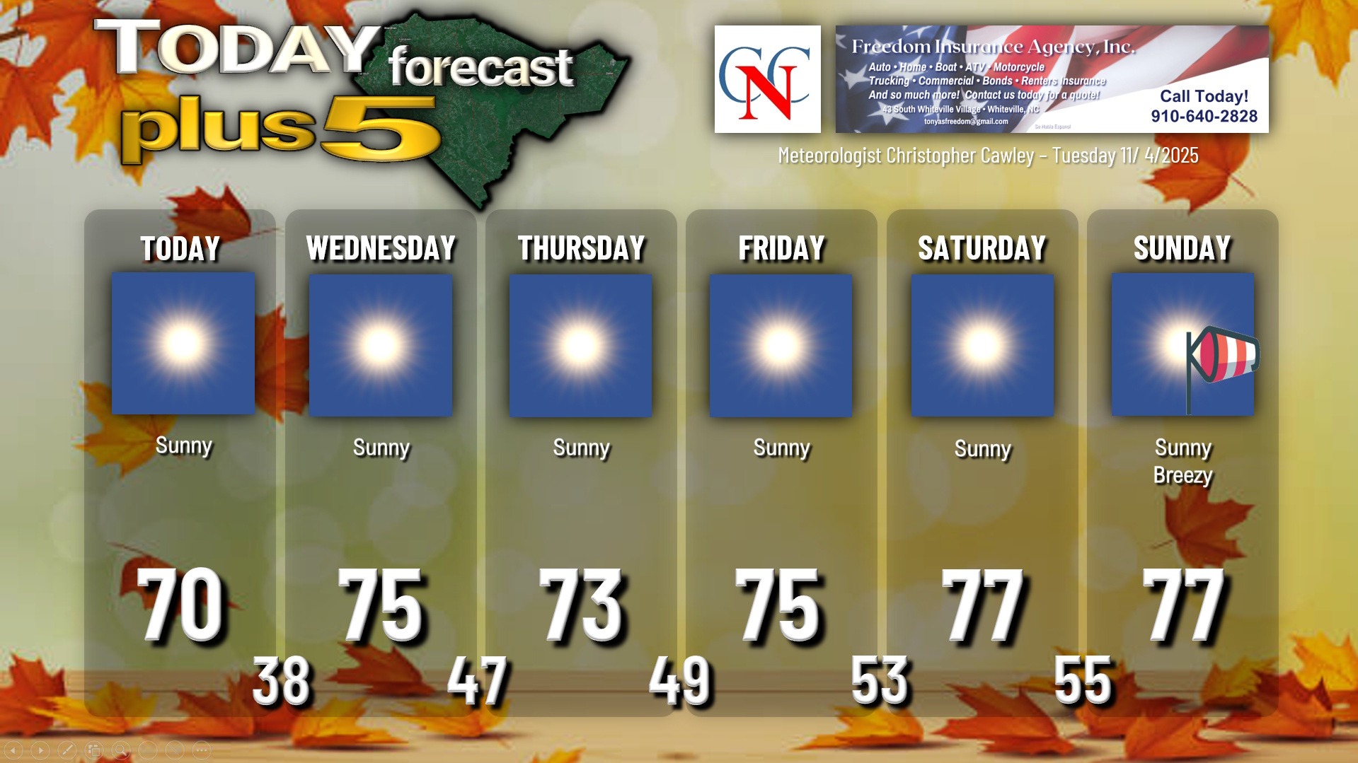 This weather update is sponsored by Freedom Insurance of Whiteville. Trust Freedom Insurance to give you clear blue skies when it comes to home, car, boat, or whatever insurance you need. Let Freedom provide customized coverage to keep you and your family safe. Contact Freedom today at 910-640-2828!