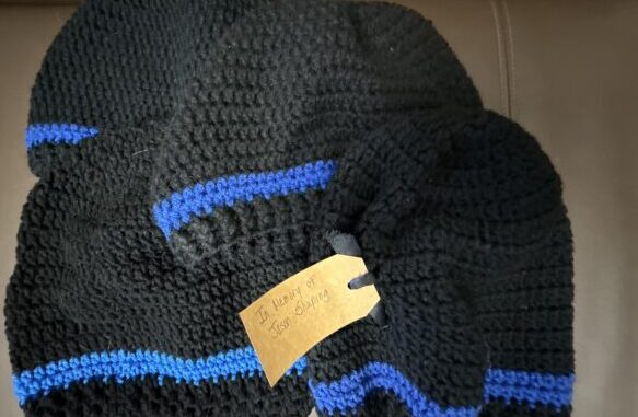 Pam’s mom, Pattie, crocheted beanies for Brunswick County Officers as gifts in memory of her late husband.