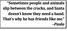 “It’s okay,” Paula said. “Sometimes people and animals slip between the cracks, and Santa doesn’t know they need a hand. That’s why he has friends like me.”