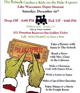 Speaking of the Polar Express, the Lake Waccamaw Depot Museum still has tickets available for ‘The Grinch Catches a Ride on the Polar Express’ event on Saturday, Dec. 13. Parents can take advantage of some holiday shopping after you drop off the kids at 6 p.m. and pick them back up at 9 p.m.