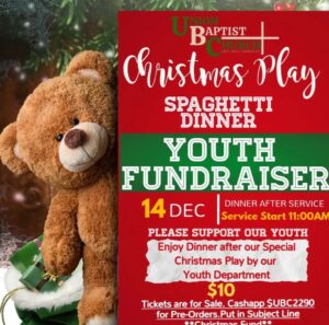 Union Baptist Church will have their Christmas play and spaghetti fundraiser dinner on Dec. 14. The dinner will begin after services that Sunday. Plates are $10 each and proceeds will go to support the youth program.