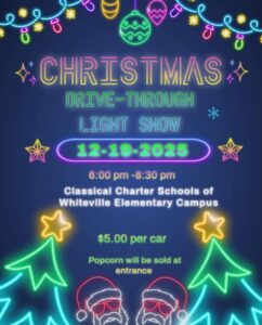 Classical Charter Schools of the Whiteville Elementary Campus will present a Christmas Drive Through Light Show on Dec. 19 from 6-8:30 p.m. The cost is $5 per car, and popcorn will be sold at the entrance.