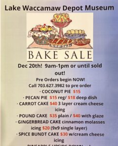 The Lake Waccamaw Depot Museum will have their annual bake sale on Dec. 20 from 9 a.m.-1 p.m. or until sold out. Preorders can be made by calling 703.627.3982.