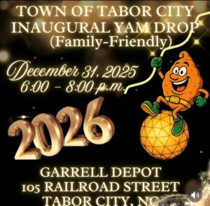 The Town of Tabor City will have their first inaugural Yam Drop on Dec. 31 from 6-8 p.m. at the Garrell Depot to ring in the new year. This event is family friendly, and everyone is invited. The depot is located at 105 Railroad Street.