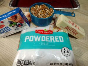 The ingredients for this frosting are incredibly simple. You’ll need one stick of room temperature butter, a teaspoon of vanilla, one block of softened cream cheese, and one cup of powdered sugar.