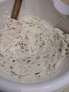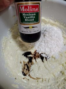 Next, mix in your powdered sugar and vanilla. Continue to beat the mixture until it’s thick and creamy.