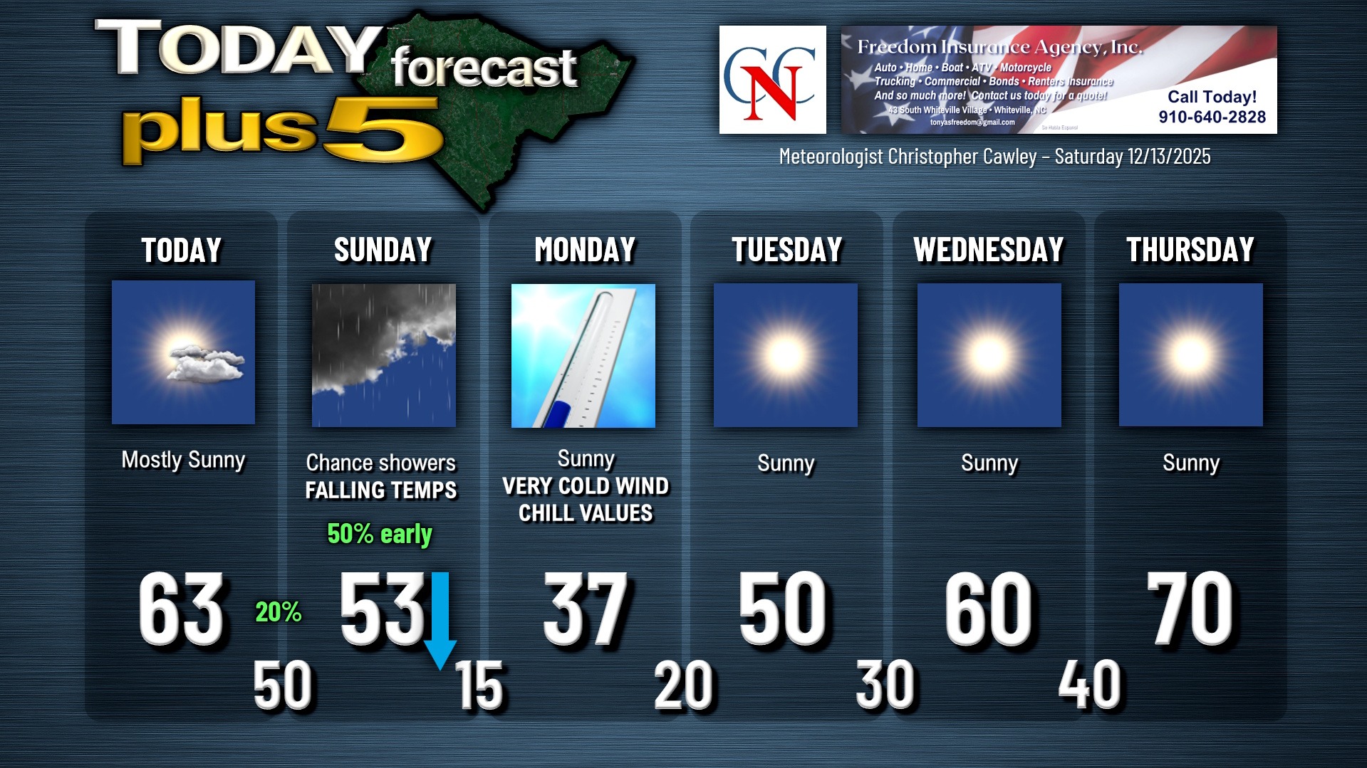 This weather update is sponsored by Freedom Insurance of Whiteville. You can trust Freedom Insurance to give you clear blue skies when it comes to home, car, boat, or whatever insurance you need. Let Freedom provide customized coverage to keep you and your family safe. Contact Freedom today at 910-640-2828!